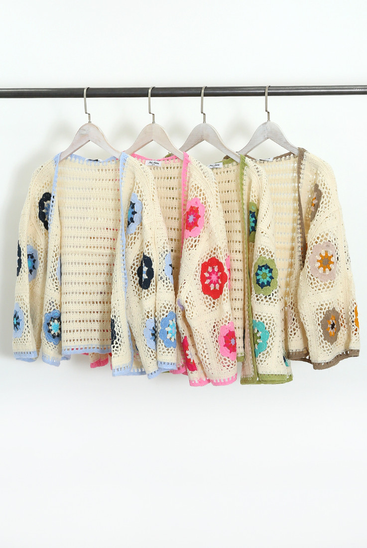 Open Floral Crochet Cardigan Flower Pattern Open Front Two Tone Style Number: 79008 Available Colours: Pink, Blue, G… Log in for pricing