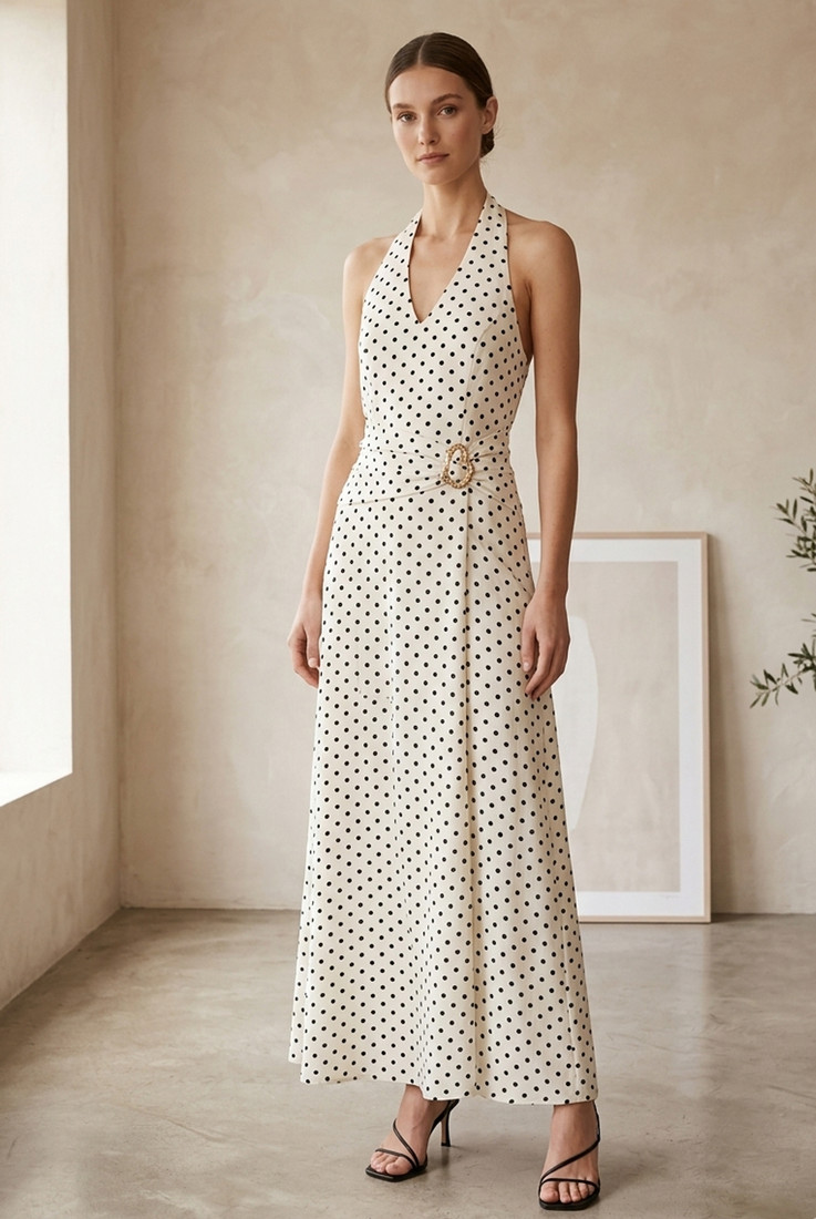 Polka Dot Halter Neck Maxi Dress Mesh Detail Maxi Polka Dots Halterneck Max Buckle Wrap Style Number: K9-06 Colours: Black,Beige,Wh… Log in for pricing