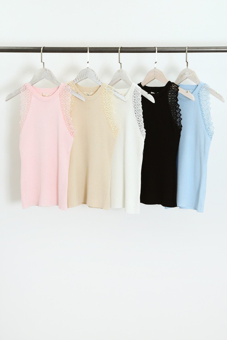 Lace Trim Soft Knit Top Lace Trim Design Soft Knit Fabric Sleeveless Top Style Number: MC2712 Available Colours: Pink, White, Sk… Log in for pricing