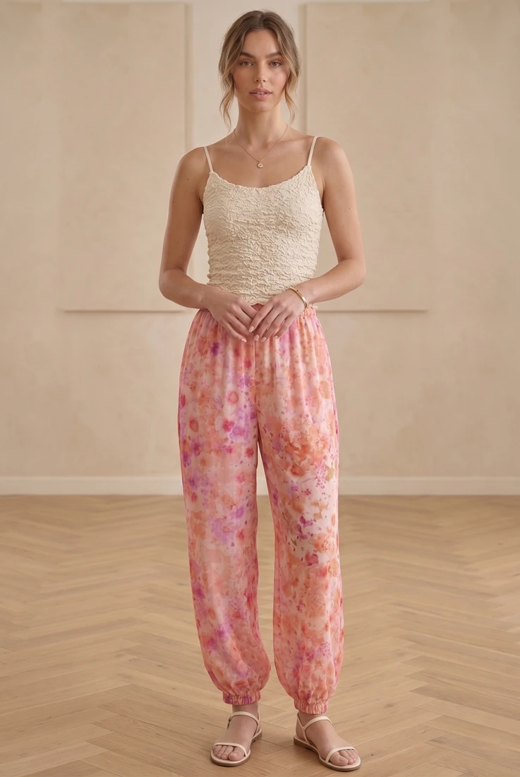 Floral Pleated Balloon Trousers Chiffon Floral Print Fabric Pleated Elasticated Waist Design Cuffed Ankles Balloon Hem Styling Style Num… Log in for pricing