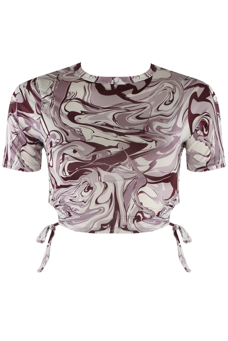 Marble Print Fabric Side Ruched Tie Up Style Short Sleeves Crop Top Style Number : SET2025 Available Col…
