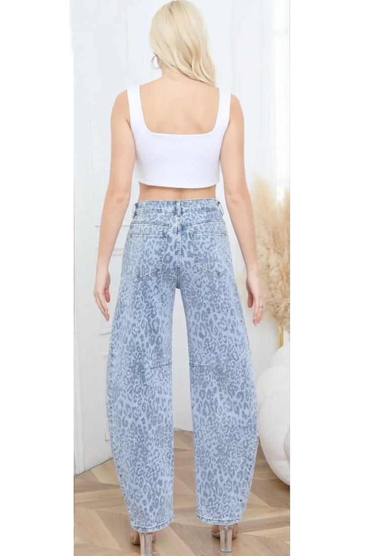 Light Blue Leopard Print Barrel Jeans Barrel Jeans Side and Back Pockets High Waist Design Denim Jeans Leopard Print Style Number: Y3361… Log in for pricing