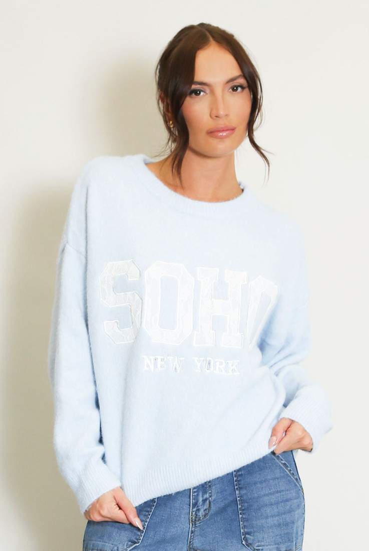 Lace Soho Slogan Wool Blend Jumper Wool Blend Fabric Long Sleeve Jumper White Embroidered Slogan Front Style Number : AM1000 Availabl… Log in for pricing