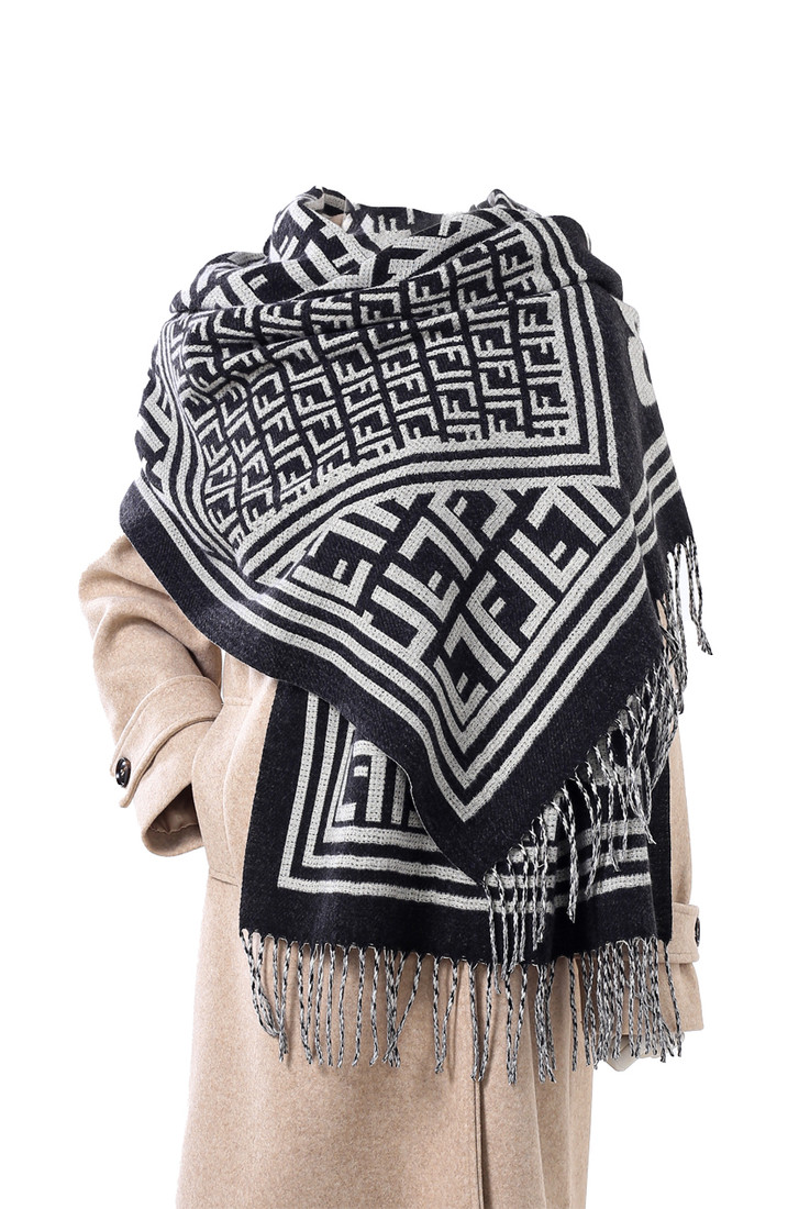 Designer Inspired F Print Wool Blend Scarf Designer Inspired Print Tassel Hem Style Number : 83056 Available Colours : Black, Beige, Taup… Log in for pricing