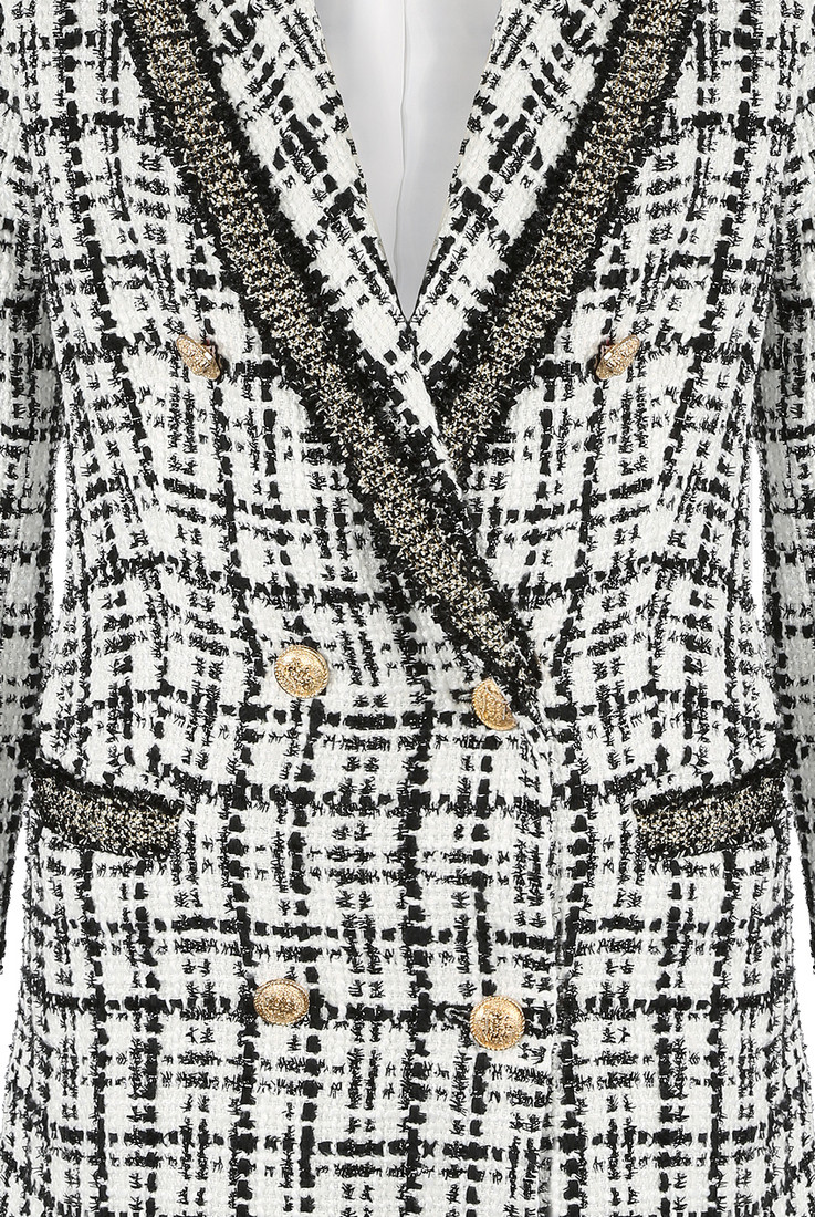 Metallic Thread Check Double Breast Blazer Metallic Threads Trim Check Fabric Golden Button Trim Double Breast Blazer Side Flap Pockets Long Sleeves w… Log in for pricing